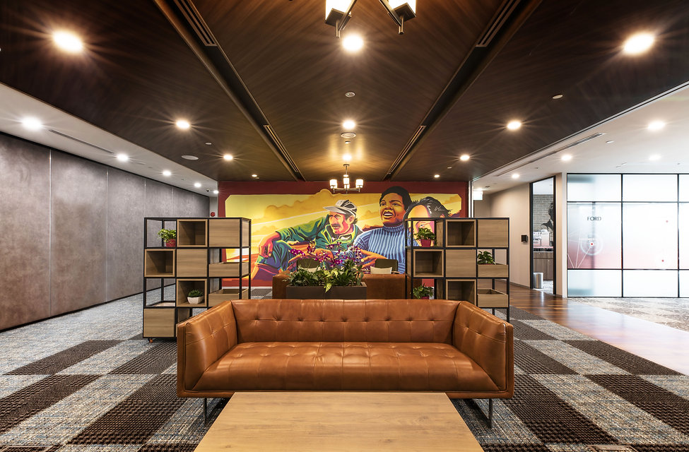 Abstract lines & shapes, inspires a dramatic synergy that sparks the imagination & foster Communications and Creativity for the younger employees. In order to create such an environment for the training hub, we collaborated with young artists to create feature mural walls exhibiting the milestones/ information of our client in an interesting manner through the scope of these budding artists.